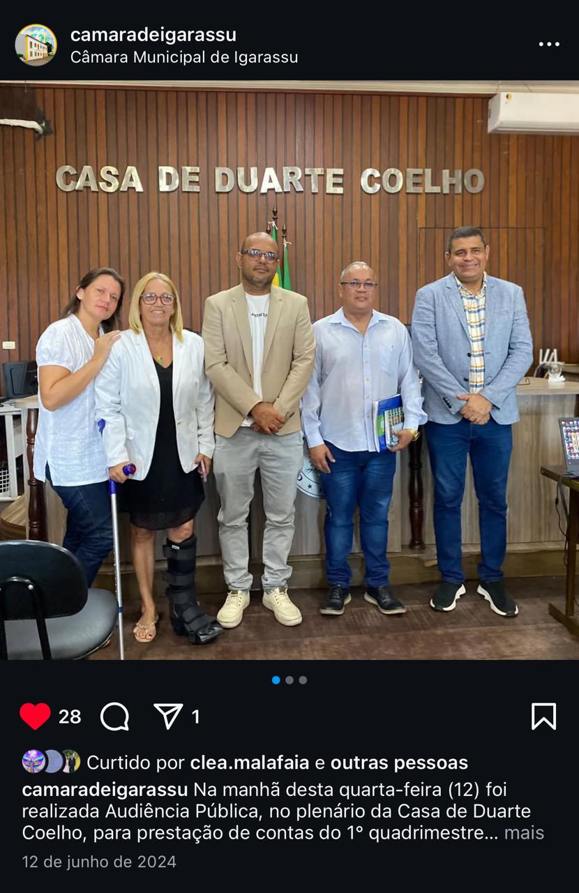 A Câmara Municipal de Igarassu reitera seu total compromisso com a transparência, a responsabilidade institucional e a dedicação ao povo de Igarassu. Ontem, durante a audiência pública de apresentação do Relatório de Gestão Fiscal do primeiro quadrimestre pela Prefeitura, os vereadores Son Albuquerque e Saúba do Povão foram designados para representar todos os parlamentares da Casa, seguindo o procedimento que vem sendo adotado na casa há vários anos nesse tipo de reunião conforme fotos, contudo mantendo o compromisso da Câmara com a fiscalização e a seriedade que a pauta exige.