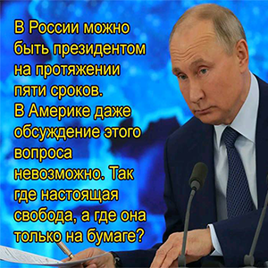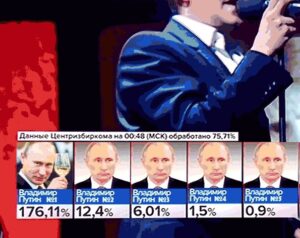 Esse meme, surgido no Dvach satiriza o sistema eleitoral viciado da Rússia, em que só o Putin é eleito.