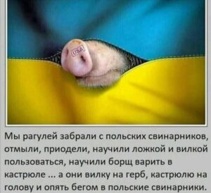 (1) O texto descreve a tentativa de integrar ucranianos na cultura russa ao ensiná-los a “usar talheres e cozinhar borscht”, mas eles acabam incorporando elementos culturais da Europa Ocidental e protesta para ser como um deles. No meme, ucranianos são representados por um porco carimbado pela sigla dos Estados Unidos (USA).