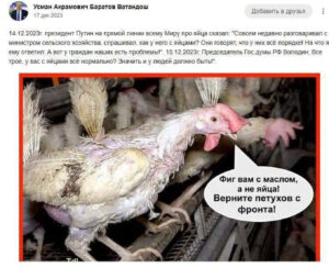 A montagem de uma galinha desvigorosa e depenada com um balão de fala foi o bastante para colocar a autoridade dos uzbeques na Rússia, Usman Baratov, na cadeia. A galinha diz: “Vá se catar com seus ovos! Traga de volta os galos da linha de frente”.