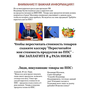 (1) Propaganda viral pró-Putin divulgando suposta medida de redução de preços, devido à inflação;